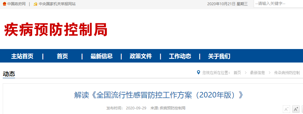 为进一步做好2020-2021年流行季全国流行性感冒防控工作,国务院应对新型冠状病毒肺炎疫情联防联控机制综合组制定了《全国流行性感冒防控工作方案(2020年版)》(以下简称《方案》)。《方案》指出,各地要根据《中华人民共和国传染病防治法》《突发公共卫生事件应急条例》等法律法规规定,按照党政主导、部门协作、动员社会、全民参与的工作机制,坚持预防为主、防治结合、中西医协同、依法科学、联防联控的防控策略,实施“强化监测预警、免疫重点人群、推进多病共防、规范疫情处置、落实医疗救治、广泛宣传动员”的举措,全面开展流感防控工作。《方案》同时从加强工作统筹、密切部门协作、推进中西医协同、强化疫情监测预警及分析研判、推动秋冬季多病共防、鼓励重点人群流感疫苗接种、提高疫苗接种便利化、加强对重点机构及人群密集场所疫情防控、及时处置聚集性疫情、提高医务人员流感防治水平、严格预检分诊、全力做好救治工作、统筹做好中医药防治流感工作、做好院内感染控制、加强国际交流、狠抓防控工作落实、切实保障防治物资供应等17个方面,对全国流感防控工作提出更加精准、细致的要求。