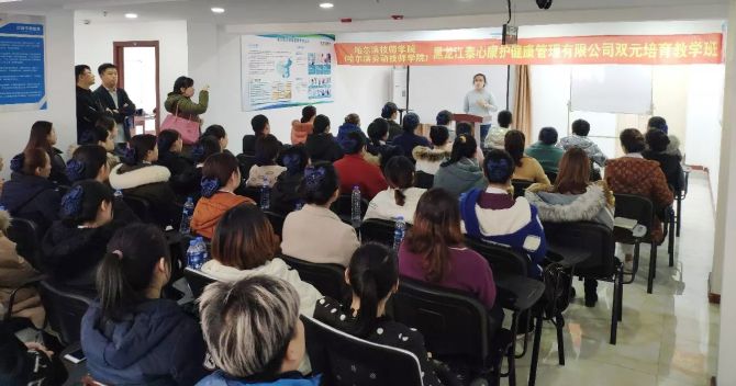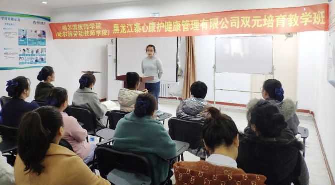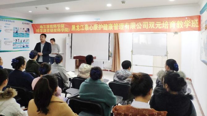 在培训班开班仪式上,黑龙江泰心康护健康管理有限公司和哈尔滨技师学院(哈尔滨劳动技师学院)签订合作办学协议,并向学员介绍了康复护理的就业前景、市场需求以及薪金报酬等方面内容。