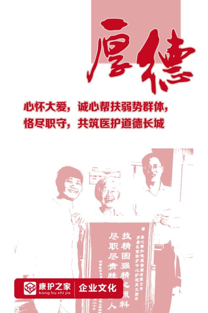 康护之家的事业,是以“人”为核心的事业,只有心怀大爱、抱着诚心助人的心态,我们才能真正感受每个患者的喜怒哀乐,才能像对待亲人一样对待患者,患者才能感受到我们发自内心的“关爱”。因此,我们要想做好服务, “厚德”是个基础。