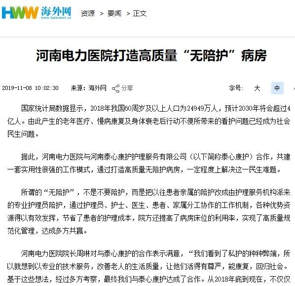 泰心康护健康管理有限公司创新医疗陪护新模式,研发“护理员-小组式整体护理模式”。即一定数量的专业护理员组成服务小组,为所在病区的患者提供全天候倒班制生活护理、同时配合科室做好门禁管理以及辅助工作。