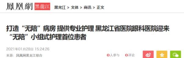 2021年1月28日“凤凰网黑龙江”发布新闻-《黑龙江省医院眼科医院迎来“无陪”小组式护理首位患者》,报道黑龙江省医院眼科医院便面向社会推出了高质量“无陪”小组式护理服务,并迎来了第一位需要小组式护理的患者。