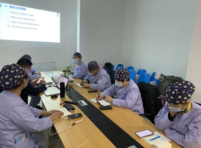 天津市胸科医院项目部上重点安排,春节期间在岗护理员年夜饭福利、春节值班人员安全等问题。