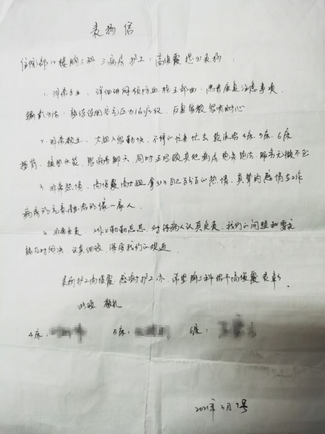 护理员高俊霞大姐说:“在小组团队的共同配合下,开科后的短短20天就收到这么多锦旗和表扬信,得到医护人员和患者的称赞和肯定,这要感谢集团为我们提供了广阔的发展空间,项目经理和主管的栽培,让我们成为优秀的护理员!”