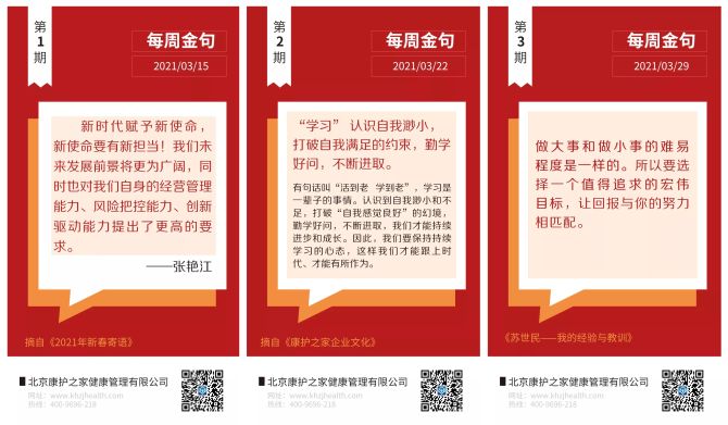 2021年3月15日起,康护之家市场部推出专栏“每周金句”,综合摘编了领导预录、管理学者言论、名著名段和集团《企业文化》等内容,每周一准时推送1期。截至目前,已推送共3期,一起回顾↓