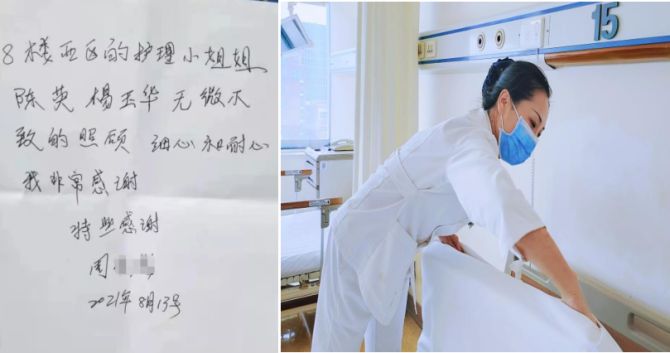 护理员陈英和杨玉华是泰达国际心血管病医院内二科的护理员。当天即将出院的患者周某把一封感谢信送到护士手上。这封写在一张很小的纸条上的感谢信是他前一天得知自己快要出院时连夜赶写的,感谢护理员陈英和杨玉华对他细致入微的照护。短短数字,字字感动着护理员的心。