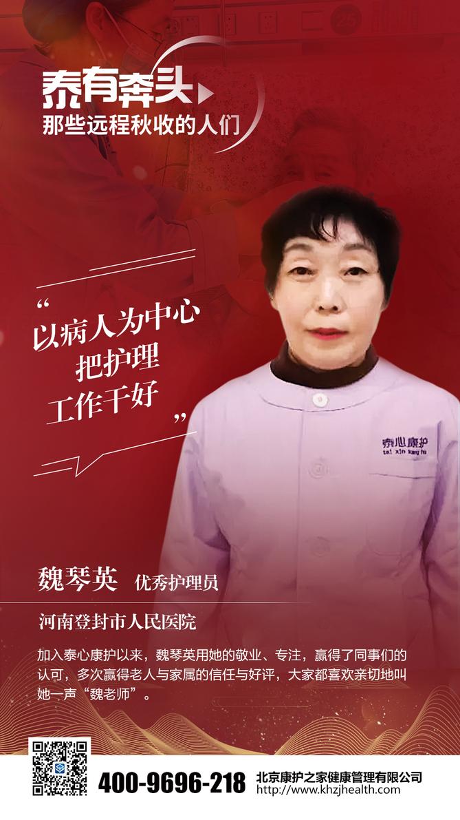 “我在工作中学到了很多知识,得到了病人的信赖,也收获了家属医生和护士的肯定,觉得自己的工作很有价值。以后我会加倍努力,以病人为中心,把护理工作干好,做个优秀的泰心康护工作者”。