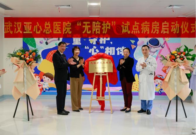 武汉亚心总医院医务部杜微微主任、泰心康护公司湖北区域熊永新总经理、武汉亚心总医院护理部徐冬萍主任、儿科刘洋主任共同为“无陪护”试点病房揭牌。