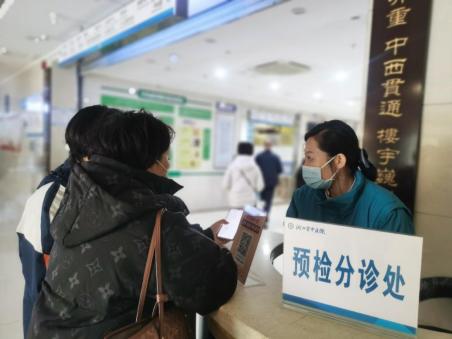 河北省中医院预检分诊处 导医在耐心解答家属的提问