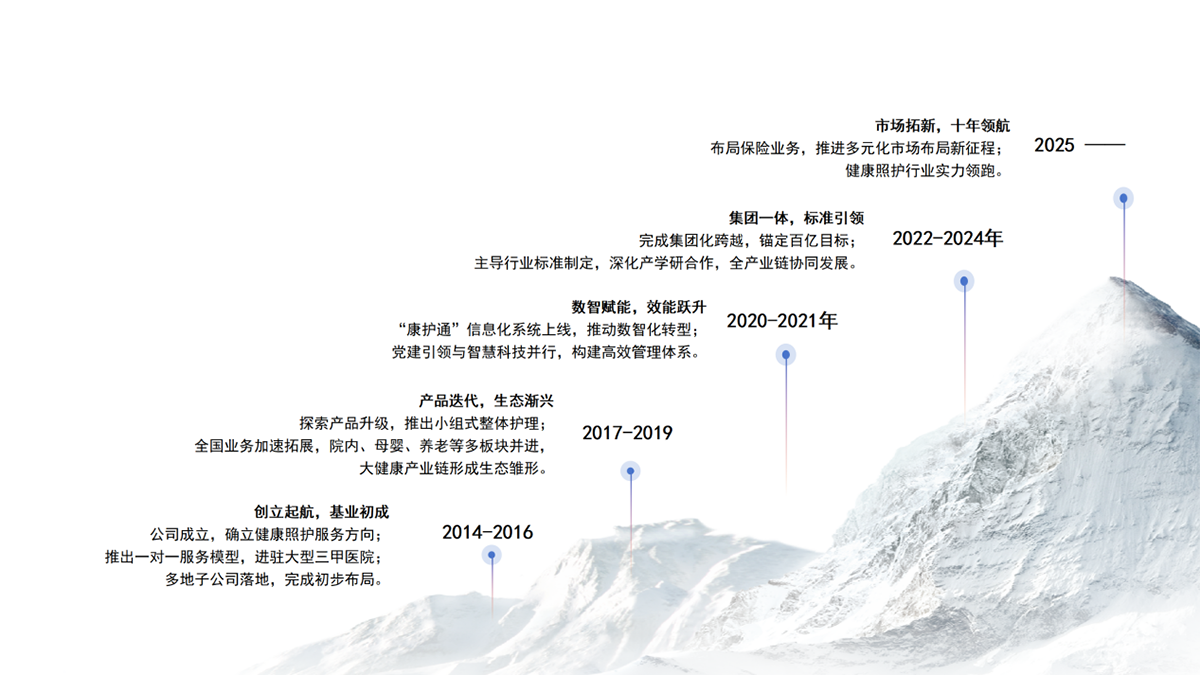 多年间完成了行业标准研究、产教融合、母婴护理服务、患者护理服务、医康养融合服务、护士派遣、护理产品研发、增值产品销售、智能护理设备研发、保险衍生服务、数字护理服务等多元业务的整合。业务覆盖全国29个省市,实现了从"护理服务商"到"健康产业基础生态"的跃迁。