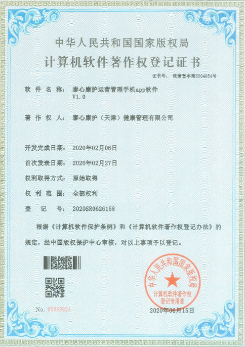 泰心康护运营管理手机app软件获得软著权证书