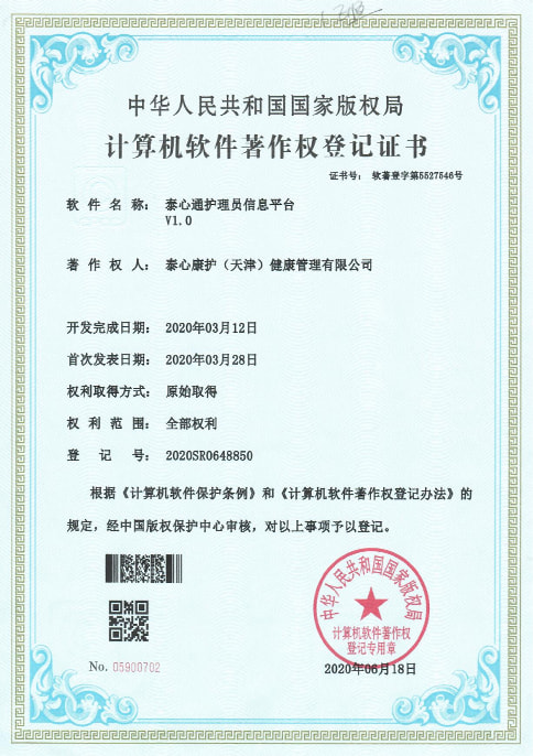 泰心康护运营管理手机app软件获得软著权证书